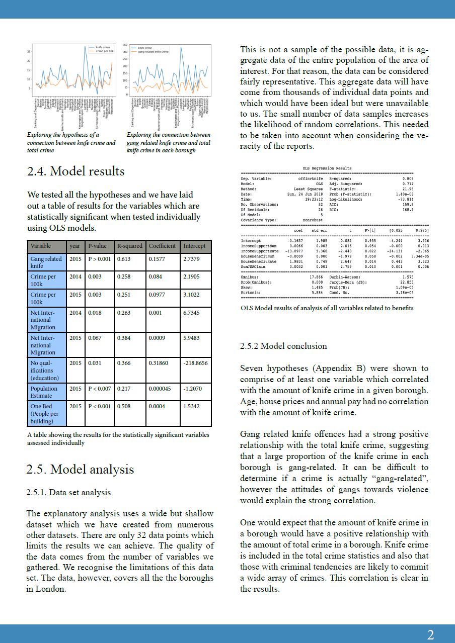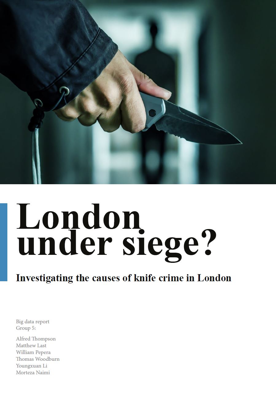 In this group project, we performed an exploratory analysis and created an explanatory model of knife crime in London. In addition to this we performed an analysis of stop and searches as a potential threat to the police officers undertaking them. The motivations for this project were prompted by the media coverage of knife crime in London and was performed as a learning exercise into a range of different big data methods: